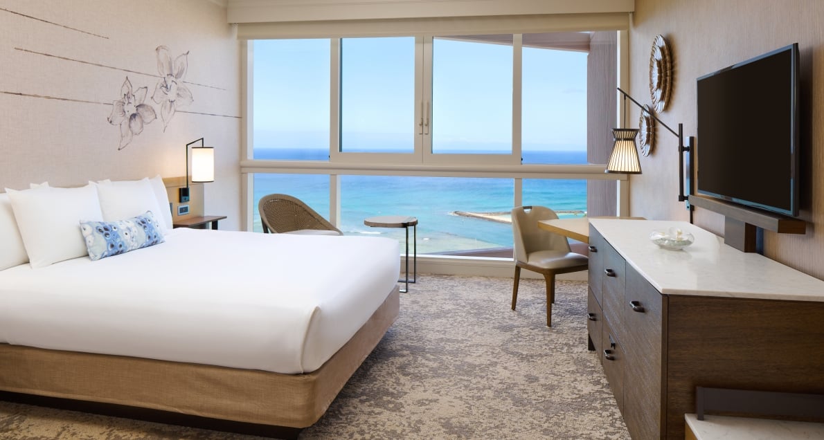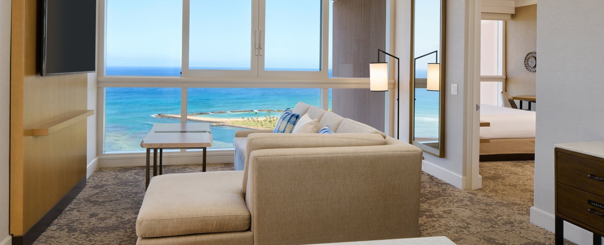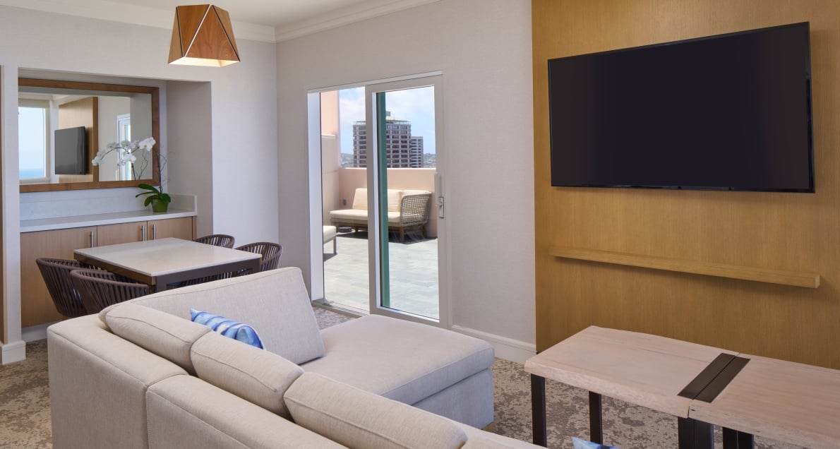 Sun-soaked Oceanfront Suite, with views of the yacht harbor and the Pacific Ocean.