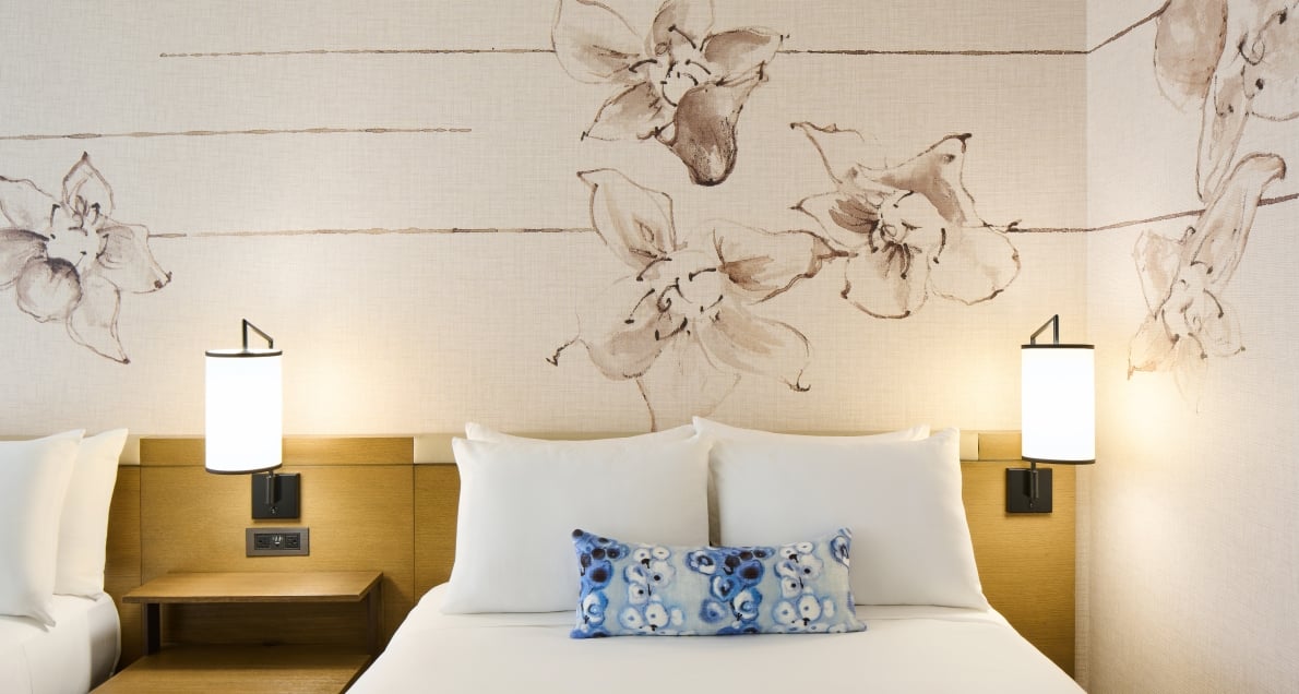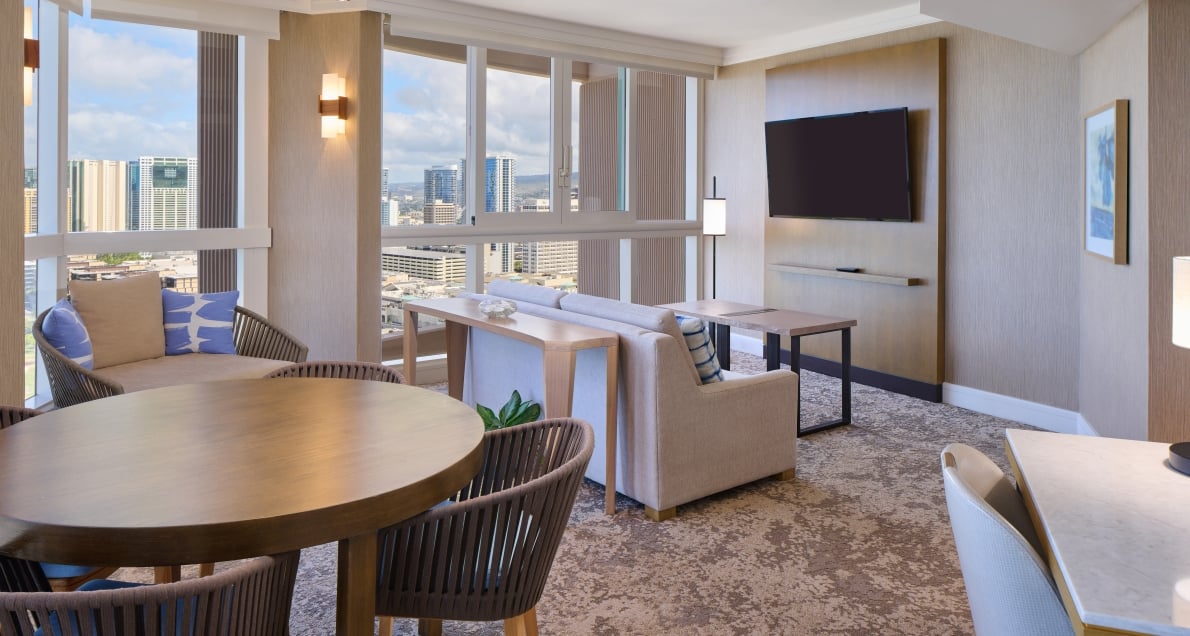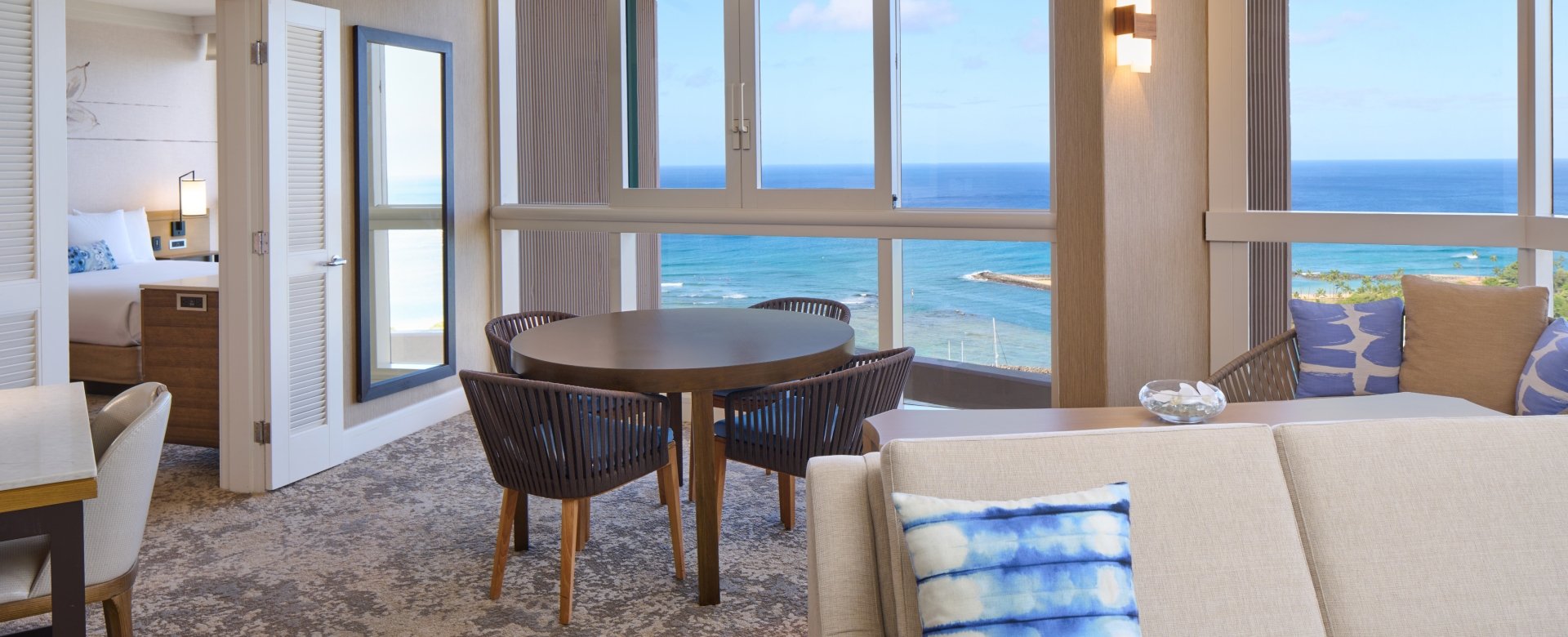 Find luxury infused into every detail of our sun-soaked one-bedroom Oceanfront suites, with views of Waikiki Beach, the yacht harbor, and beyond. Floor-to-ceiling windows frame your wide-open living room, featuring a dining table for four, sofa, lounge chair, and spacious desk. Even more space awaits in your ocean-view bedroom, with a small sectional sofa perfectly positioned alongside your cloud-like bed.